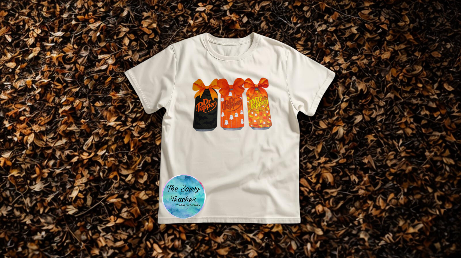 This cream-colored t-shirt features a charming fall-inspired design with playful bows atop Dr. Pepper cans, blending seasonal style with a beloved classic brand. Crafted from soft, comfortable fabric, it offers a cozy fit perfect for casual wear. The cute and fun graphic adds a subtle festive touch, making this tee an ideal choice for fall enthusiasts seeking comfort and personality in their wardrobe.