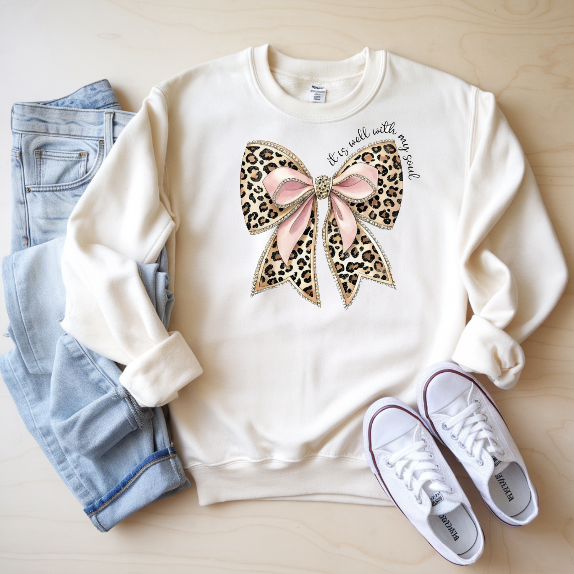 Enveloped in faith, this sweatshirt proclaims, "It is well with my soul." Featuring a light brown color and adorned with a charming bow graphic, it serves as a constant reminder of inner peace.
