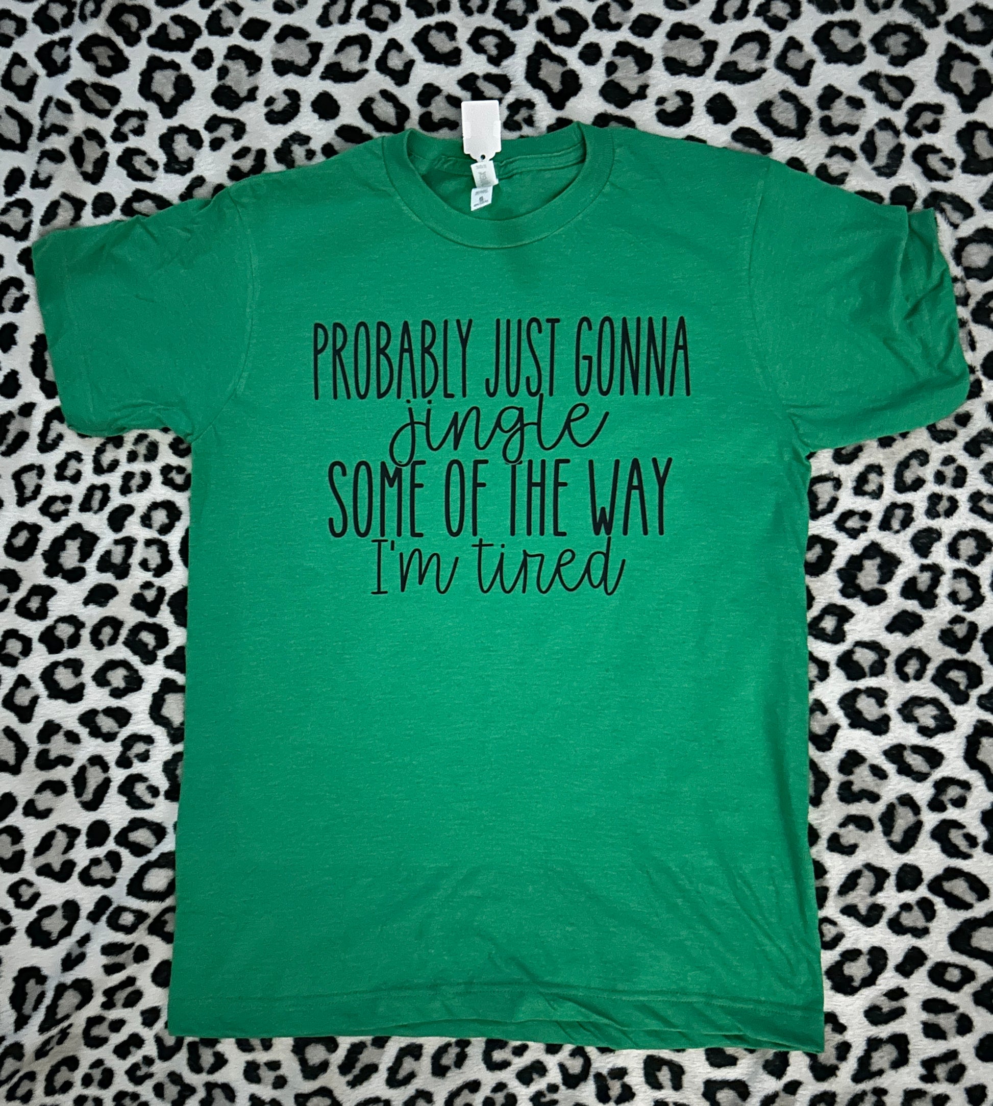 "Stay festive and comfortable this holiday season with our Kelly green soft T-shirt. With the playful phrase "Jingle Some of the Way" printed on the front, you'll be the life of any Christmas party. Perfect for busy moms who are tired but still want to join in on the holiday fun."