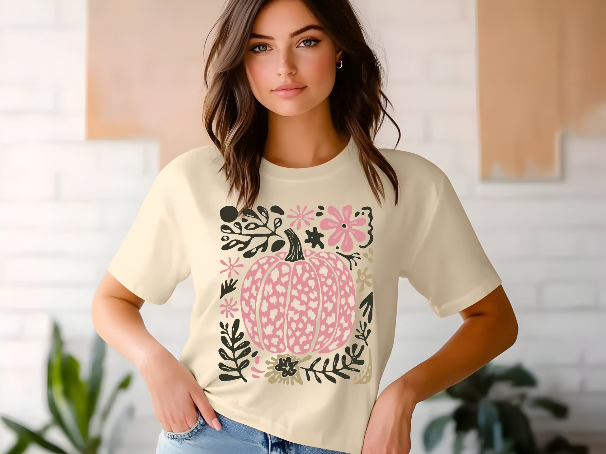 Celebrate autumn with the Boho Leopard Pumpkin cream t-shirt. Featuring a chic pink leopard-patterned pumpkin surrounded by lush greenery, this design combines boho charm with seasonal flair. Its soft cream background complements the unique blend of earthy tones and playful leopard print, making it a standout piece for fall enthusiasts who appreciate subtle style and nature-inspired artistry. Perfect for casual wear, it brings a fresh, stylish take to pumpkin season.