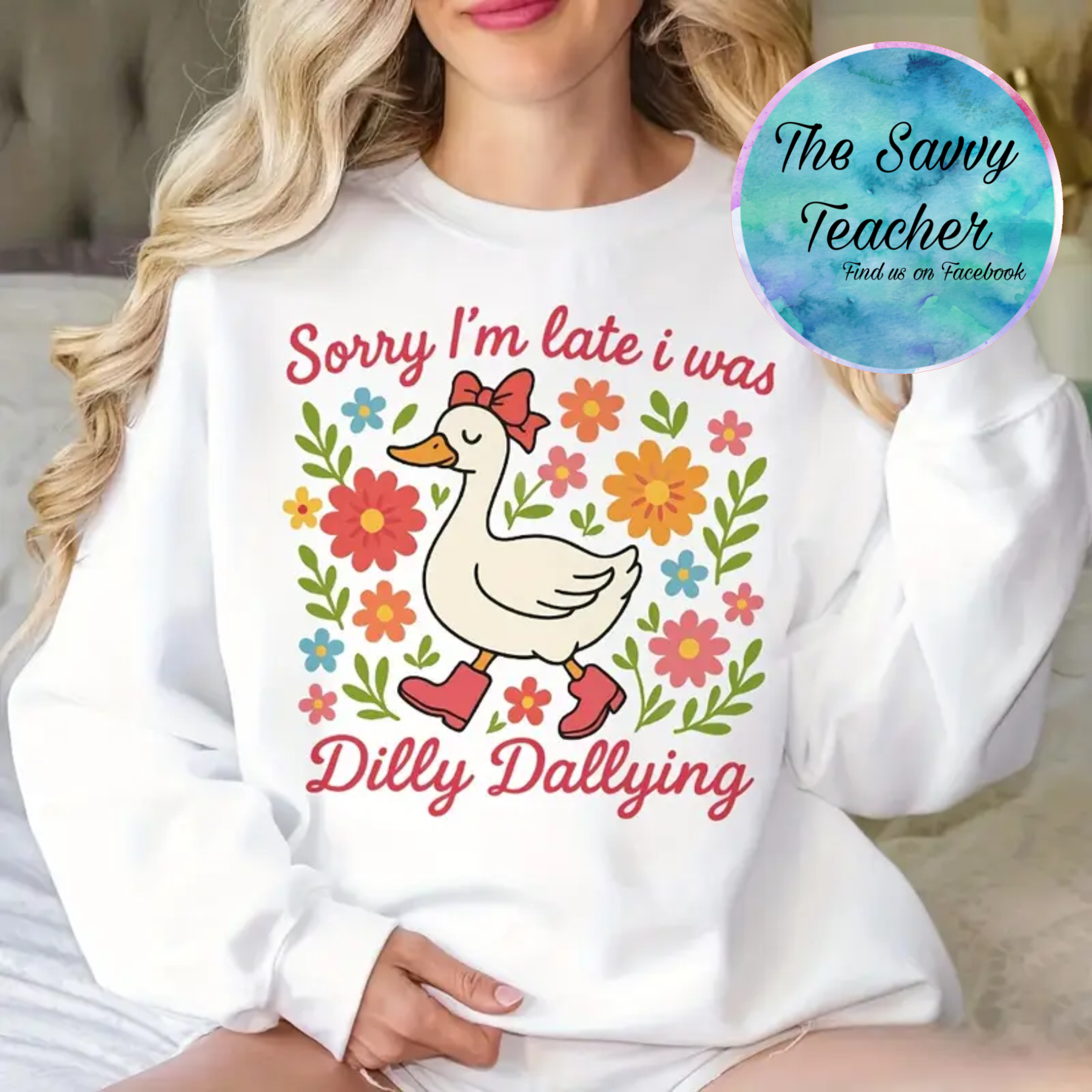 This "Dilly Dally" white sweatshirt combines softness with stylish charm. Featuring a delicate floral design intertwined with an adorable goose motif, it captures a cute and feminine vibe. The playful "Sorry I'm late, I was Dilly Dallying" phrase adds a trendy, relatable touch, making it a perfect choice for those who want comfort with personality. Ideal for casual wear, it effortlessly blends cozy fabric with contemporary style.
